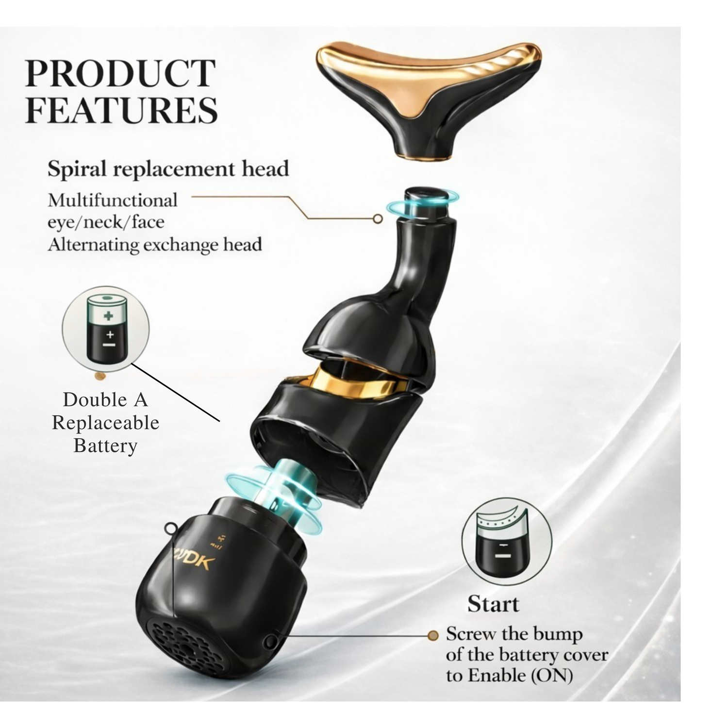 This multifunctional beauty tool offers a complete skincare solution for the eyes, neck, and face through its innovative spiral replacement head system. Designed for effortless versatility, the device allows for alternating exchange heads to target different areas of the skin with precision. It is powered by a replaceable Double A battery and features a simple, intuitive start mechanism—just twist the battery cover to the "ON" position to begin your treatment.
